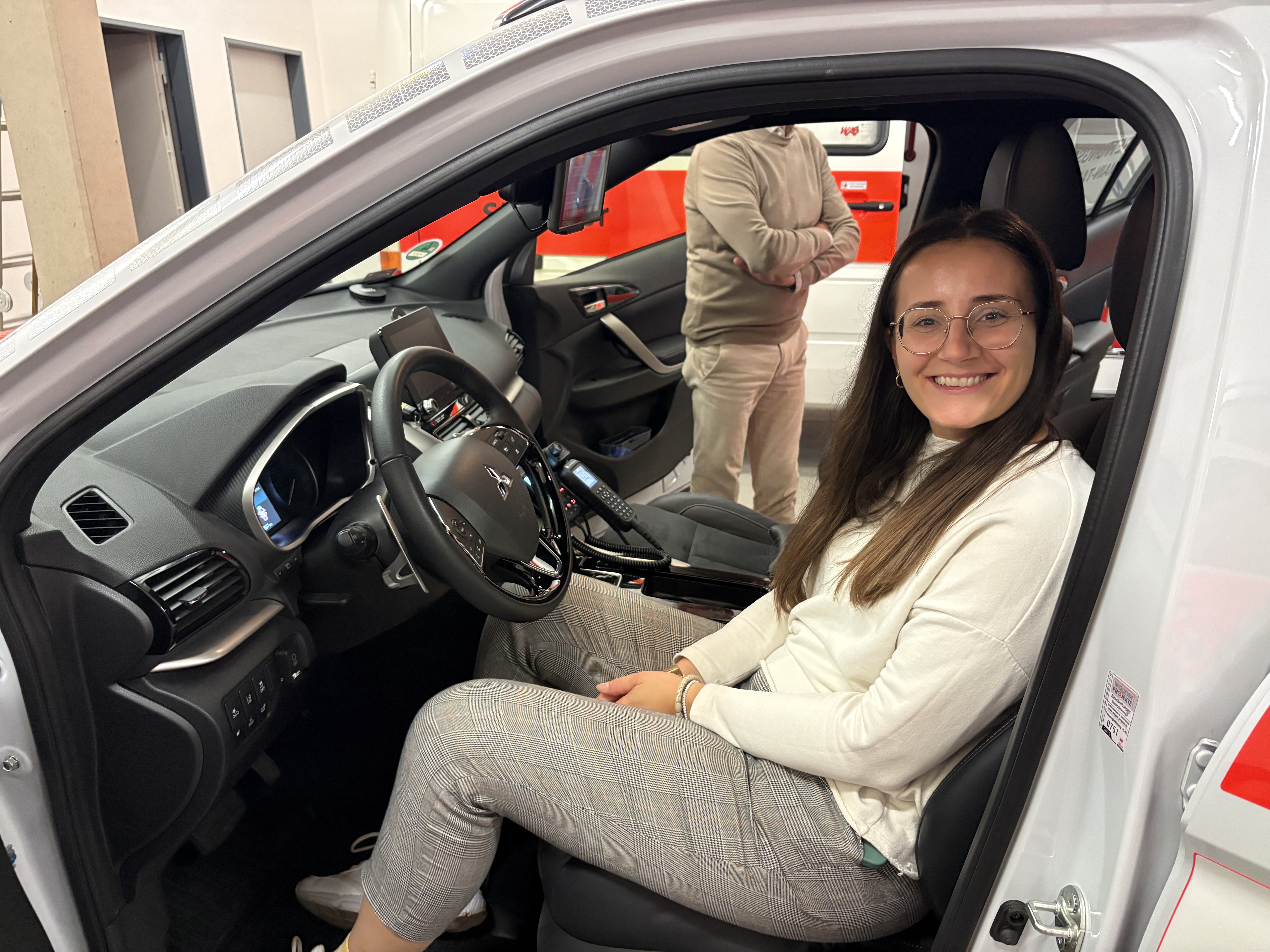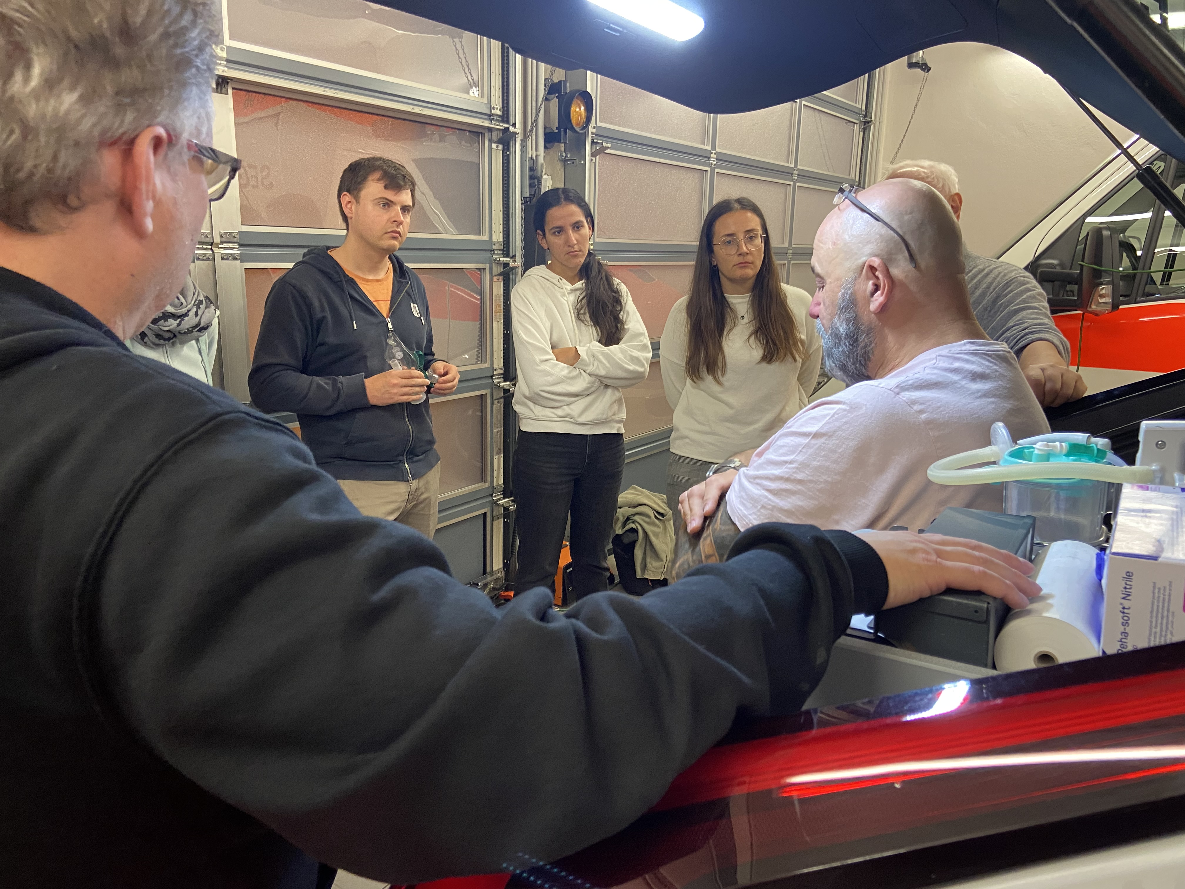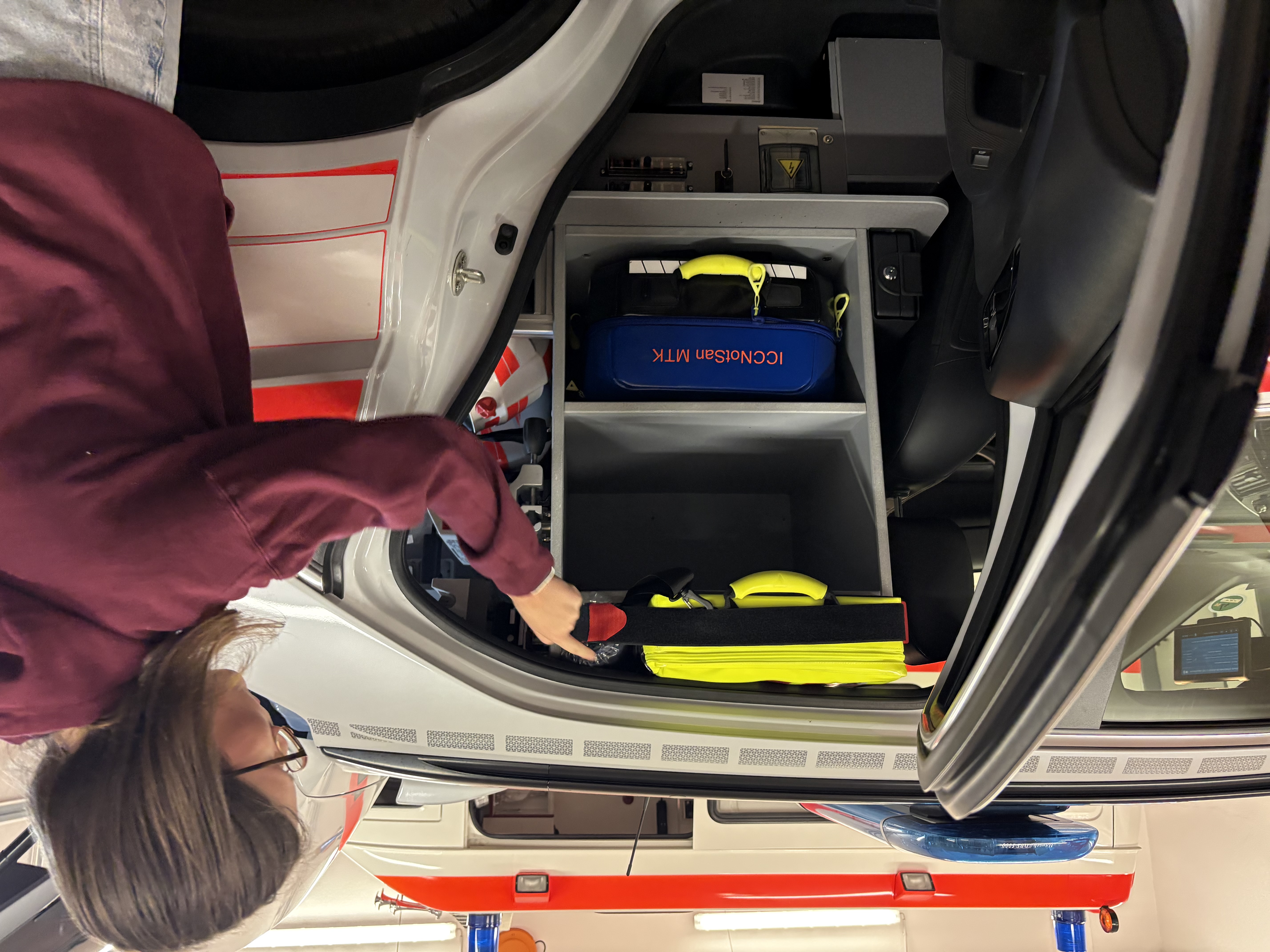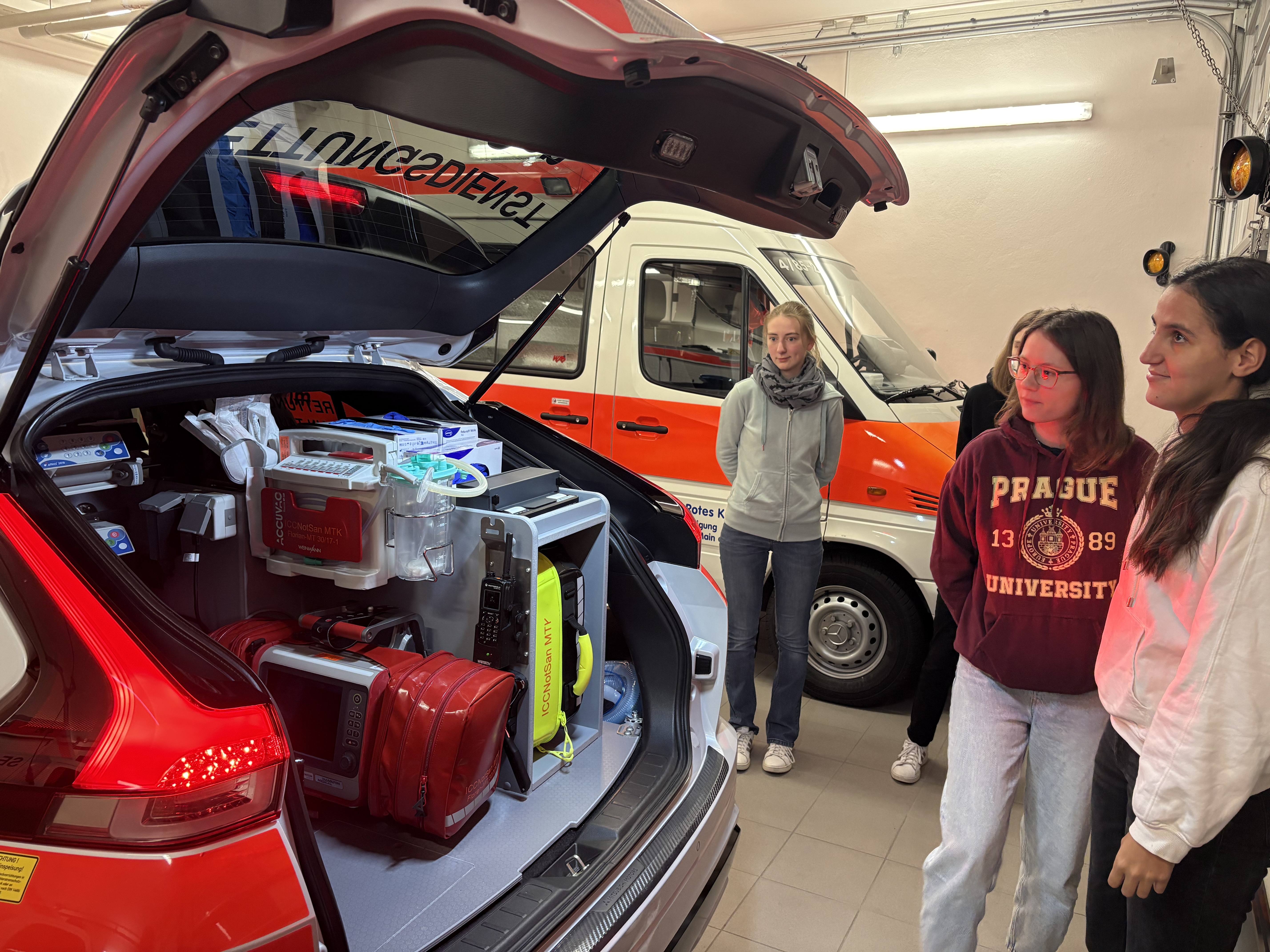 In der ersten Unterrichtshälfte stellte er das Projekt an sich, die Ausbildung des ICC NotSan und die Erfahrungen aus den ersten Wochen im aktiven Einsatz vor. Seit dem 01.09.2025 gliedert sich der ICC NotSan in den Rettungsdienst ein und versucht, die notärztlichen Ressourcen zu entlasten, damit diese für andere lebensbedrohliche Einsätze verfügbar werden. In der zweiten Hälfte konnten wir uns dann das Fahrzeug und das verladene Material genauer anschauen. Das Fahrzeug ist weitestgehend wie ein Notarzt-Einsatz-Fahrzeug ausgestattet, führt aber auch darüber hinaus einiges medizinisches Equipment mit.