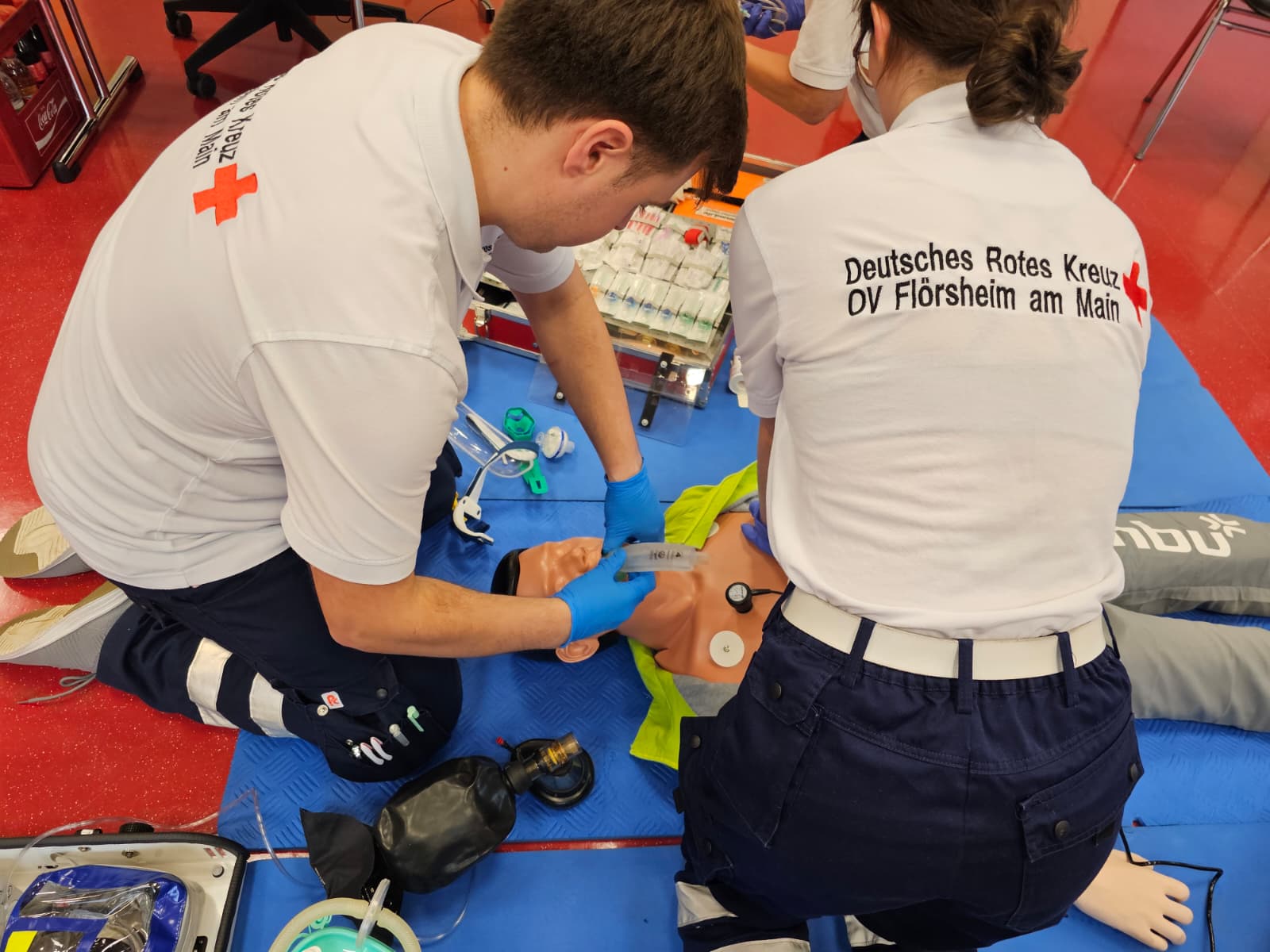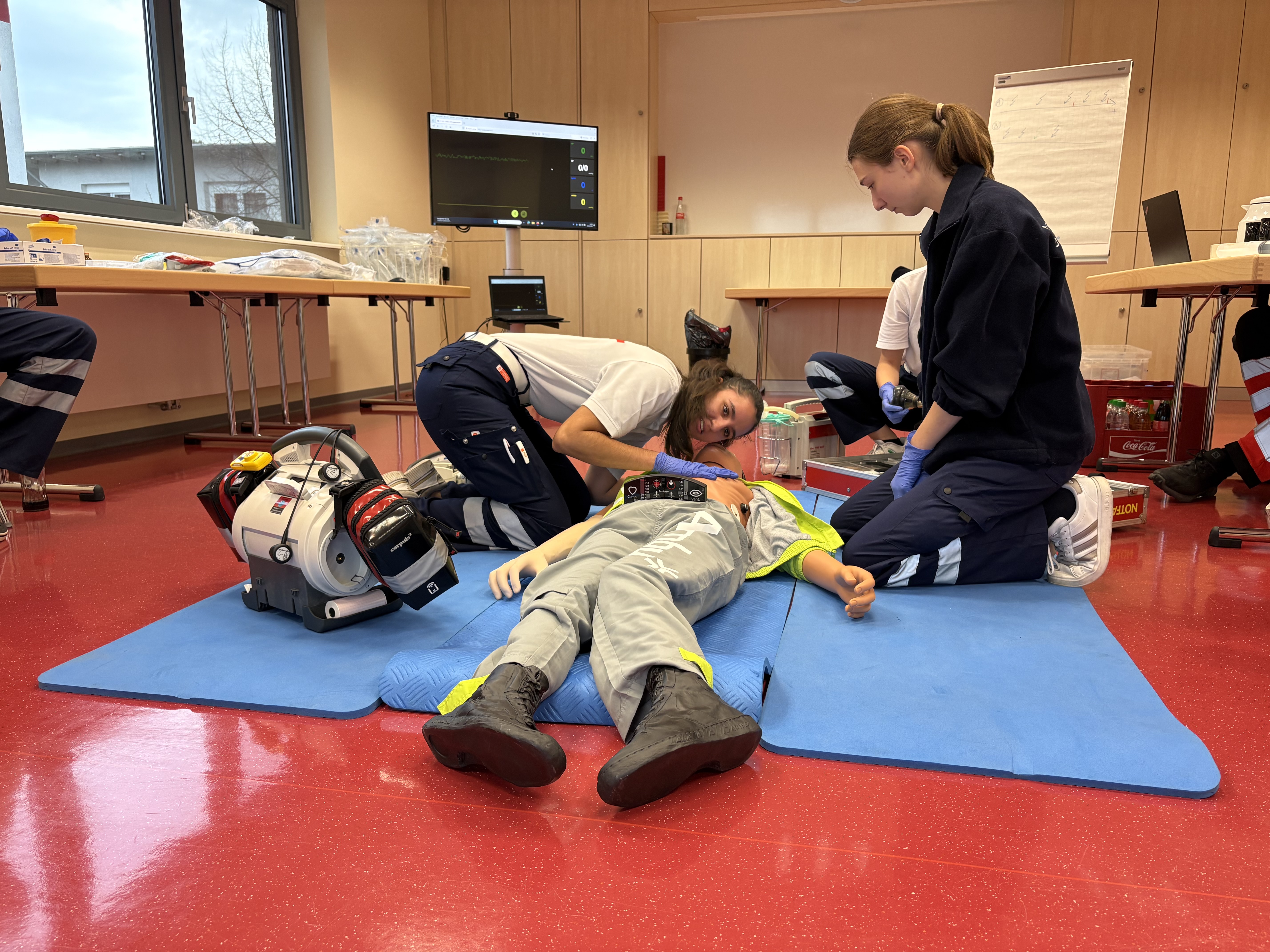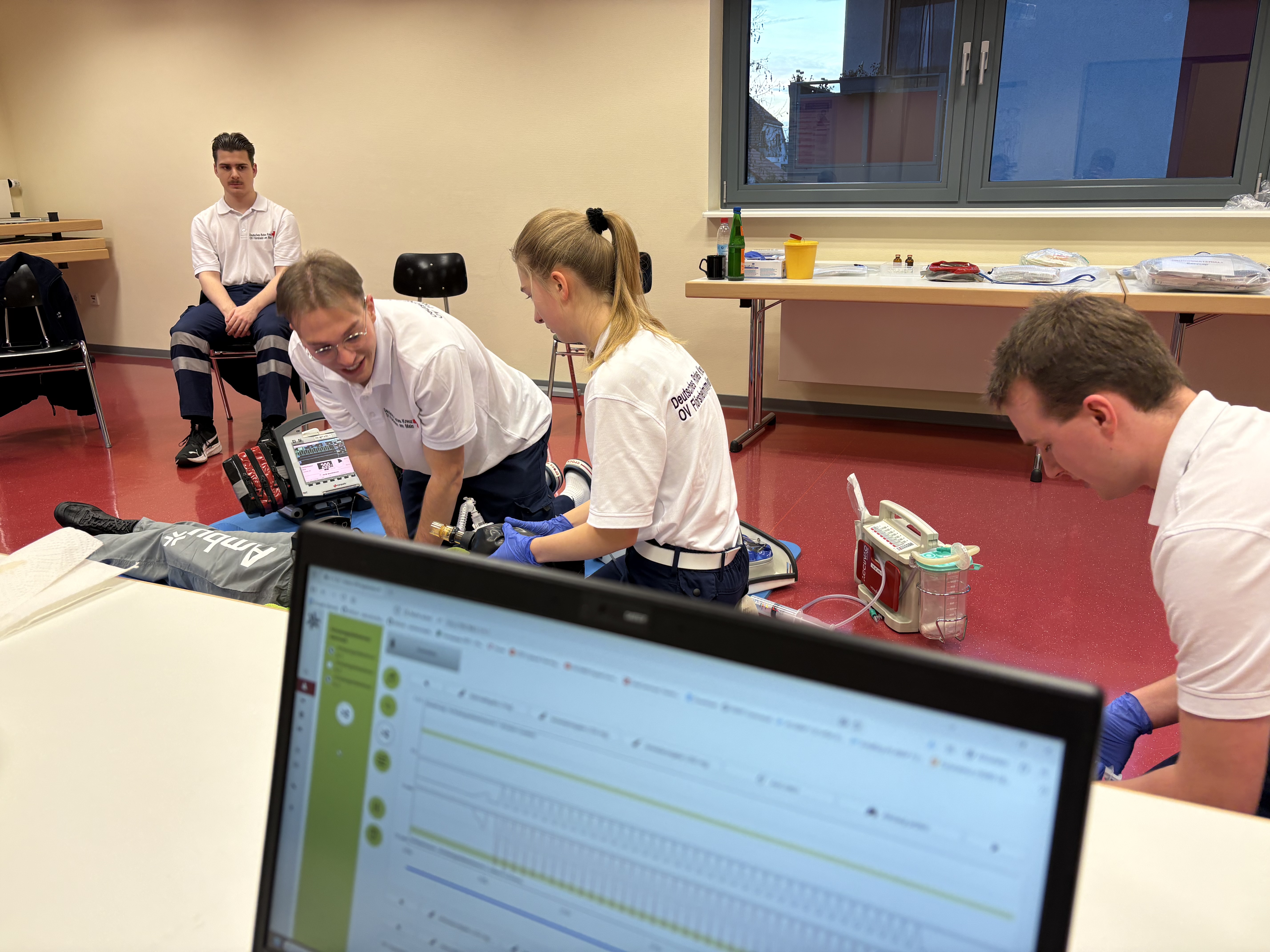 Den schriftlichen Leistungsnachweis gibt es natürlich weiterhin, zusätzlich gab es nochmal ein Reanimations-Praxistraining am wöchentlichen Schulungsabend am Mittwoch in der Woche zuvor! Bei der Praxis wird, wie die letzten Jahre auch, Wert darauf gelegt, so realitätsnah wie möglich mit unserem Equipment zu arbeiten. Außerdem wurde der Umgang mit dem etCO2 Sensor (Kapnometrie/-graphie) unseres C3-EKG/Defis geübt.