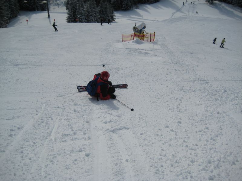 Pünktlich um 08:55 ging es auf die Piste. Der erste Sturz lies nicht lange auf sich warten und blieb ohne Blessuren (Familien-Skigebiet).